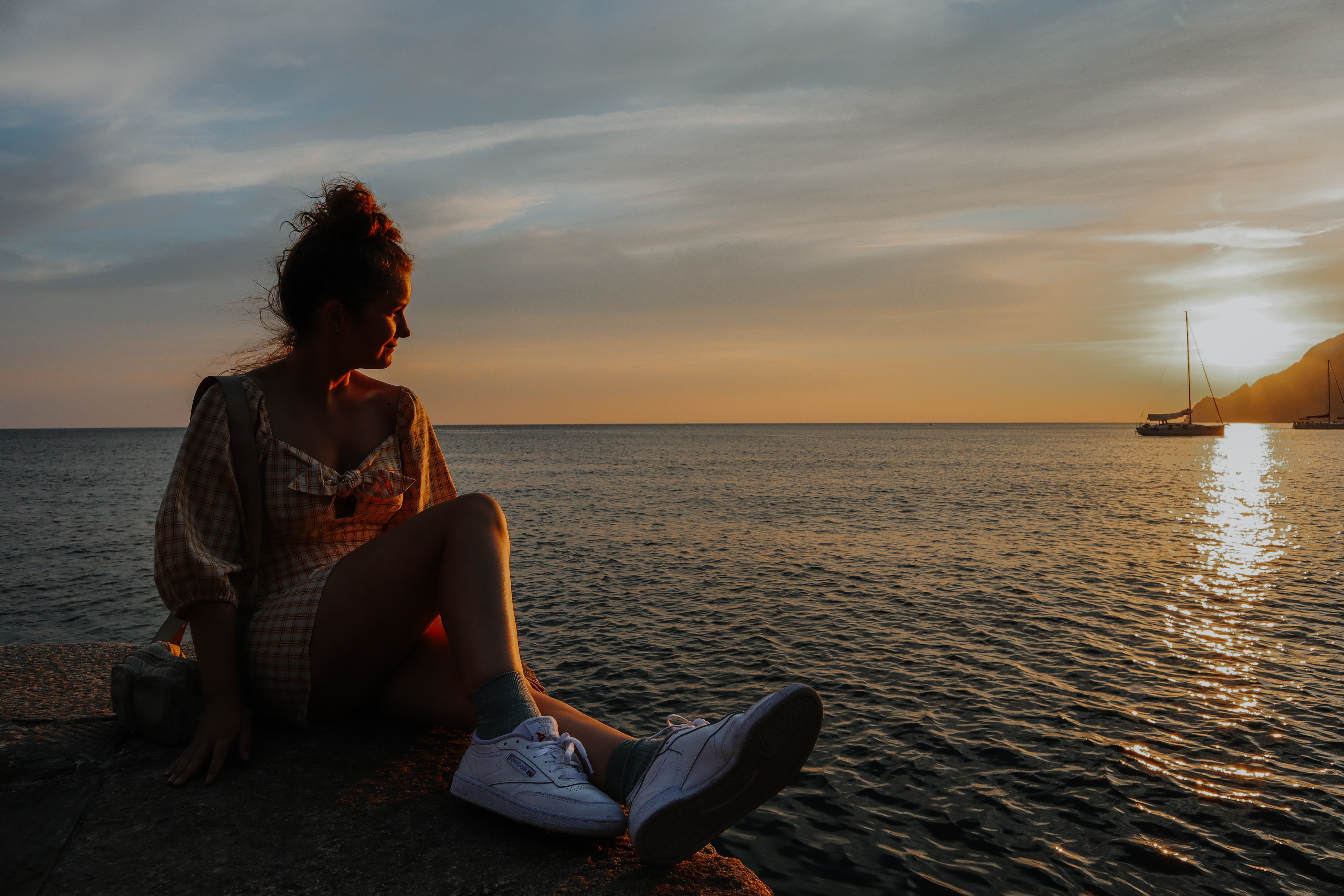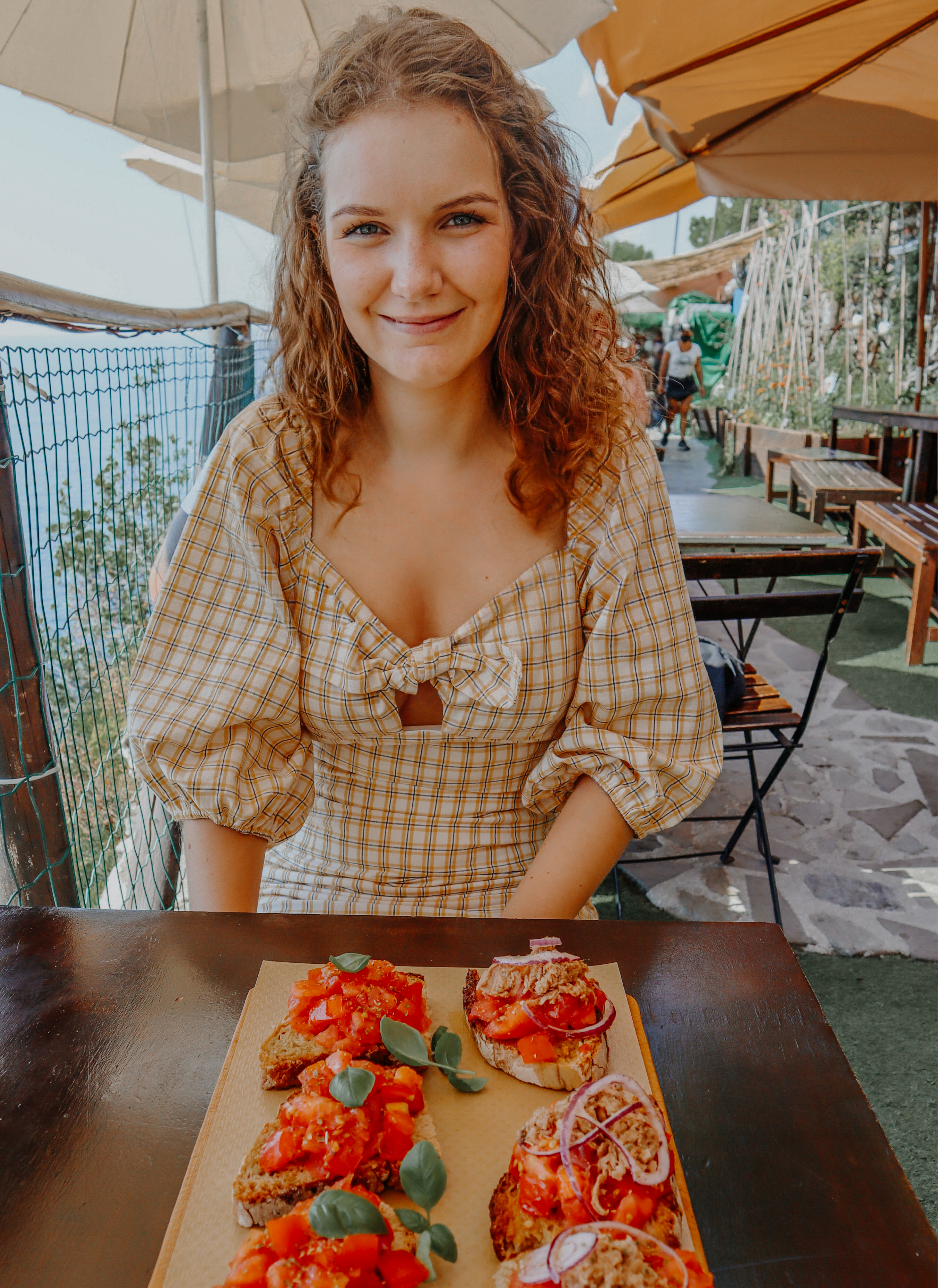 De temperatuur stijgt die middag naar ongeveer 40 graden en ik moest-en-zou mijn gele jurk met halflange mouwen dragen (want, Italiaanse vibes). We bezoeken Cinque Terre in 2020 en moeten dus ook de hele dag een mondneusmasker dragen. Je kunt je wel voorstellen dat het rond 16.30 uur hoog tijd is voor verkoeling! Na een wandeling van het Piazzetta naar het hoogste punt van het dorpje Vernazza ziet dat terrasje op de top er wel héél aantrekkelijk uit. We strijken neer voor een biertje, heer-lijk!
